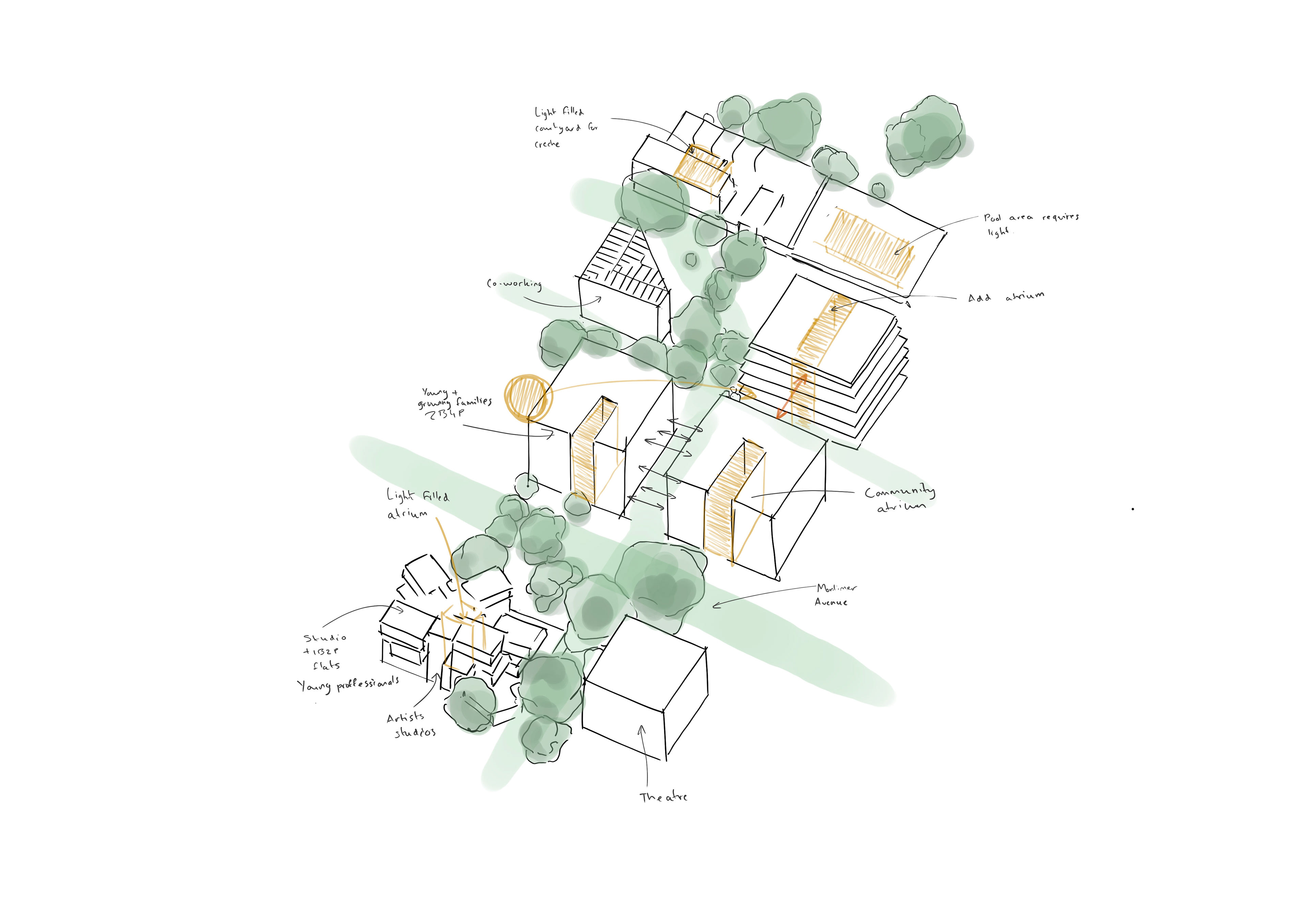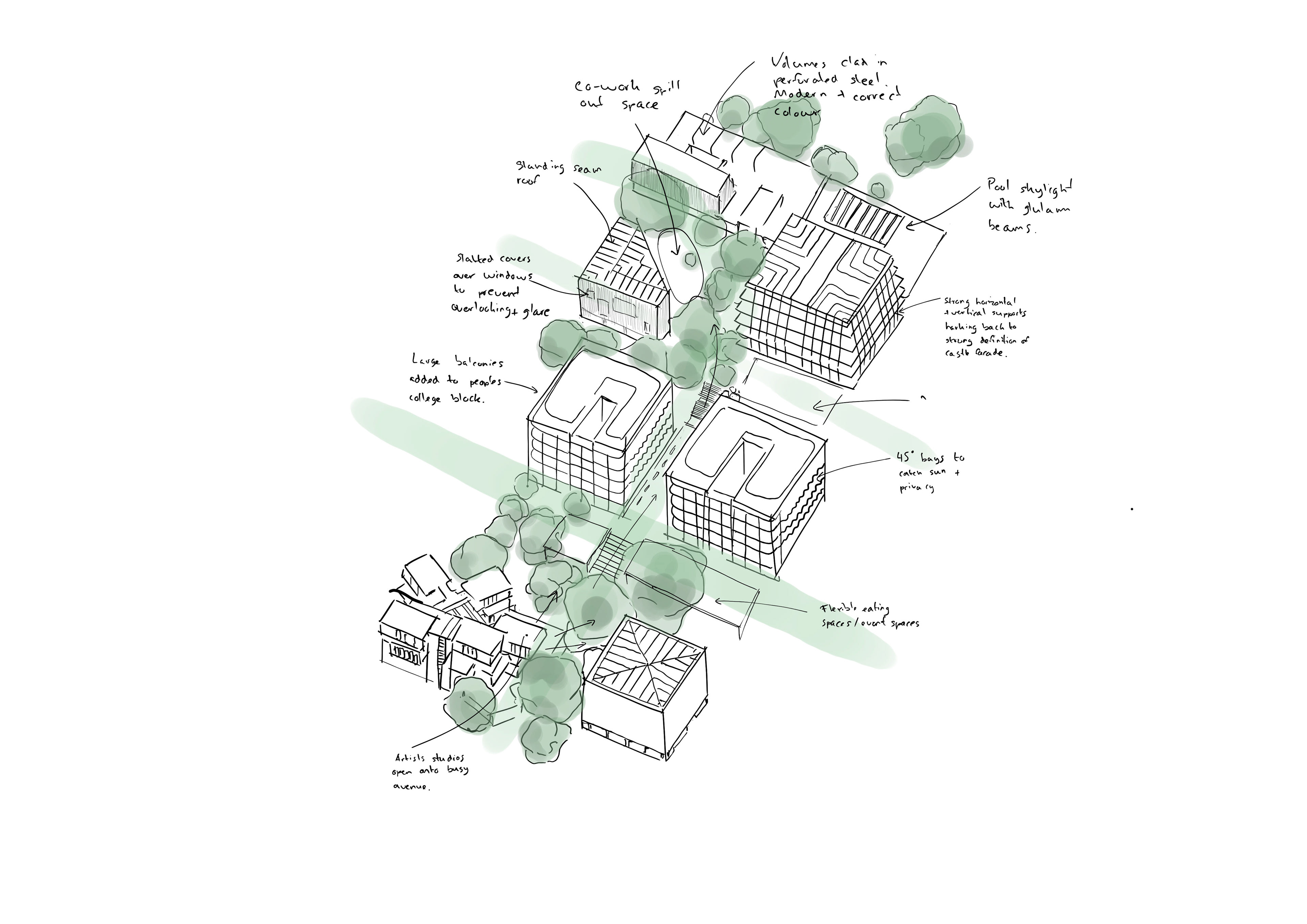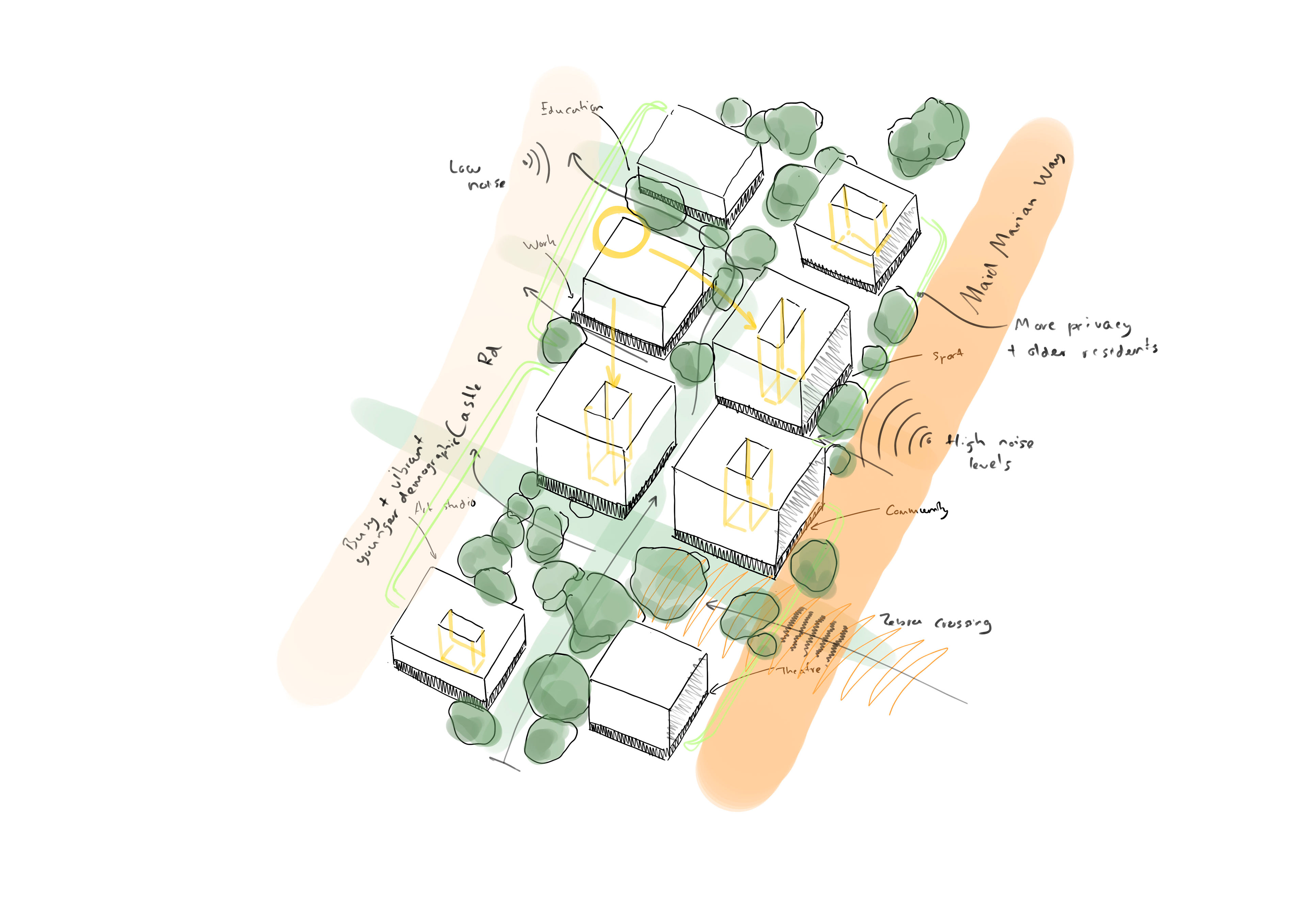 A Microraion represented a social advance where private life was fused with abundant public space and amenities. These often included health centres, cinemas, schools, theatres, libraries and clubs. Currently, many of these districts are undergoing challenging development processes as the decay of the old structures is neglected and ultimately replaced by new infrastructures, residential and commercial buildings stemming from the ever expanding elitist densification. The same may be seen on the People’s College site where proposals seek to squeeze maximum density for maximum profit. The rapid change fails to acknowledge the impacts on the communities who have lived here for generations, limiting social cohesion and reducing the possibility of sustainable urban development. Indeed, local municipalities tend to overlook the significance of these urban processes. Reimagining the microraion as a Cohousing scheme in Nottingham presents the opportunity to develop a tried and tested platform of ideas for a self contained community. In a modern setting the scheme seeks to offer a new perspective on city living with generous space and amenities connecting to the wider context.