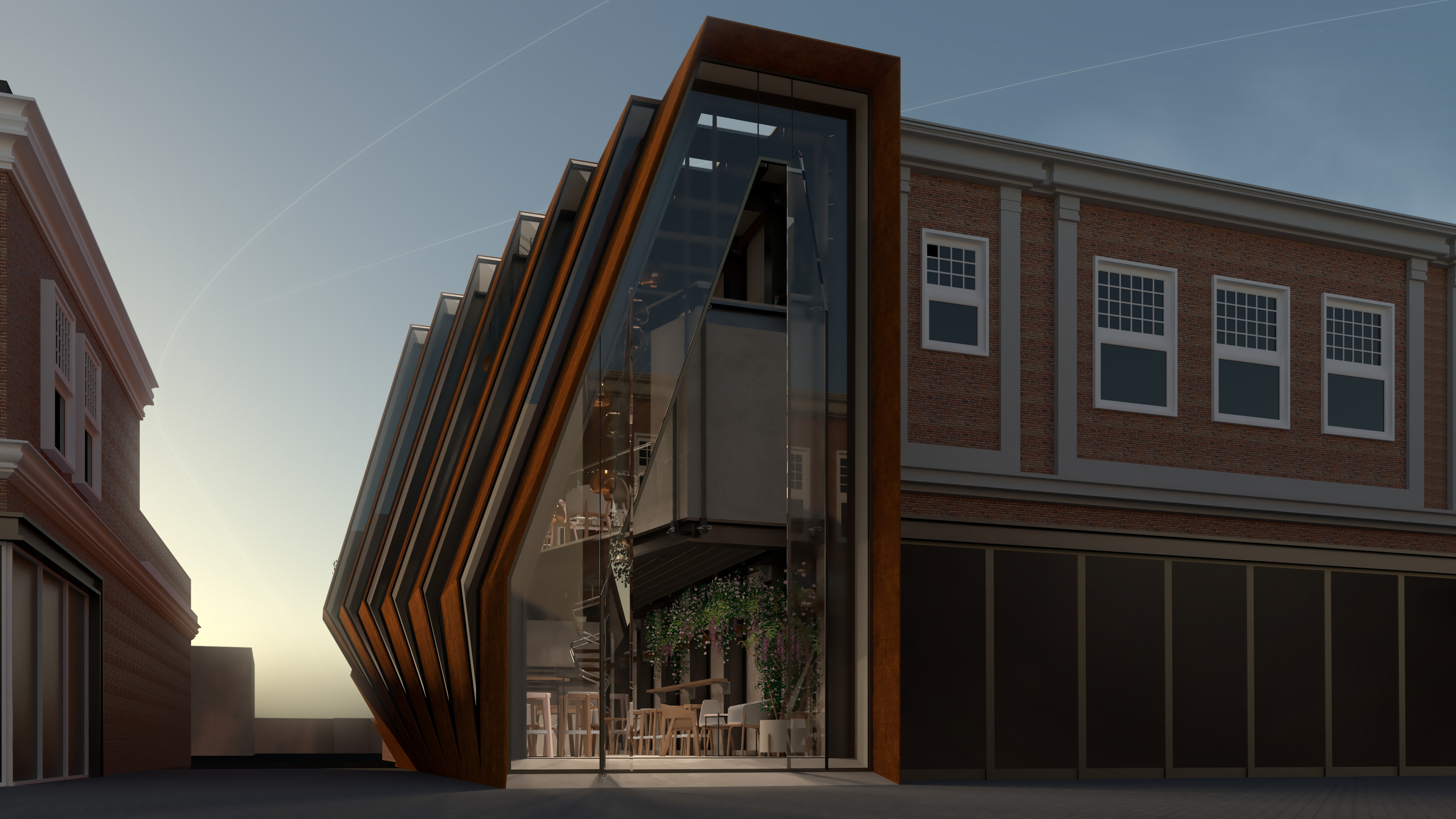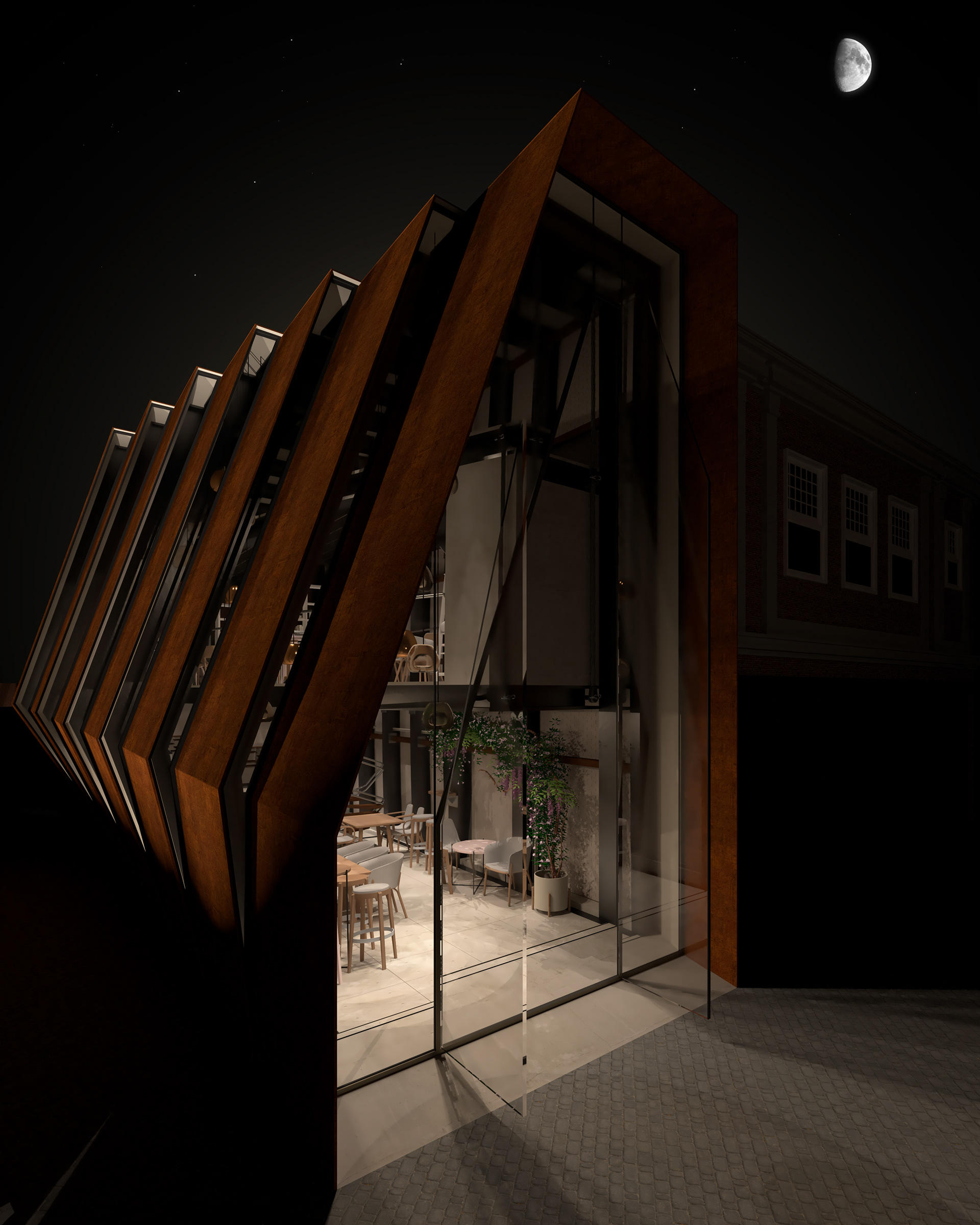 A play of layers to bring natural light into space. The coffee house expands the internal spatial quality with a suspended mezzanine floor.